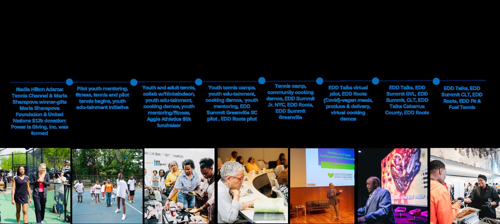 1. EDD FIT AND FUEL TENNIS: With a goal of combaCng childhood and juvenile obesity and insClling lifelong habits of opCmal wellness this free ½ day program engages youth ages 6-16 through culturally resonant tennis training, fitness coaching, nutriCon and mentorship. Led by former NCAA Division 1 & 2 tennis players and former collegiate NFL and professional fitness experts, we combine physical acCvity with introducCon of healthy vegan meals, snacks and opportuniCes to be matched with our coach-mentors.