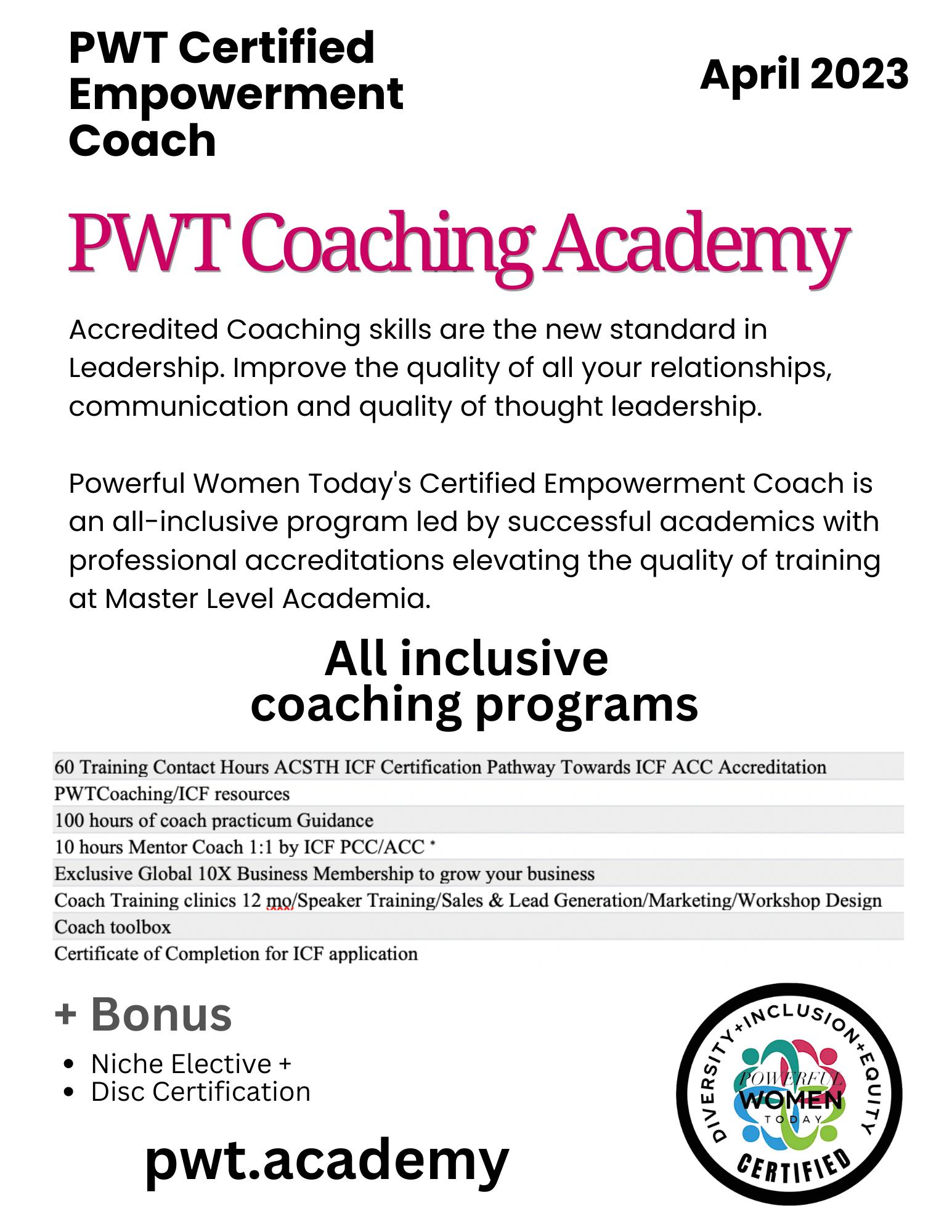 we can always get beter. It takes a lifelong learning mentality and the need, want, and desire to serve others. I am proud to be a part of PWT’s coaching academy where we help to elevate the coaching world with qualifed and certfed ICF coaches.