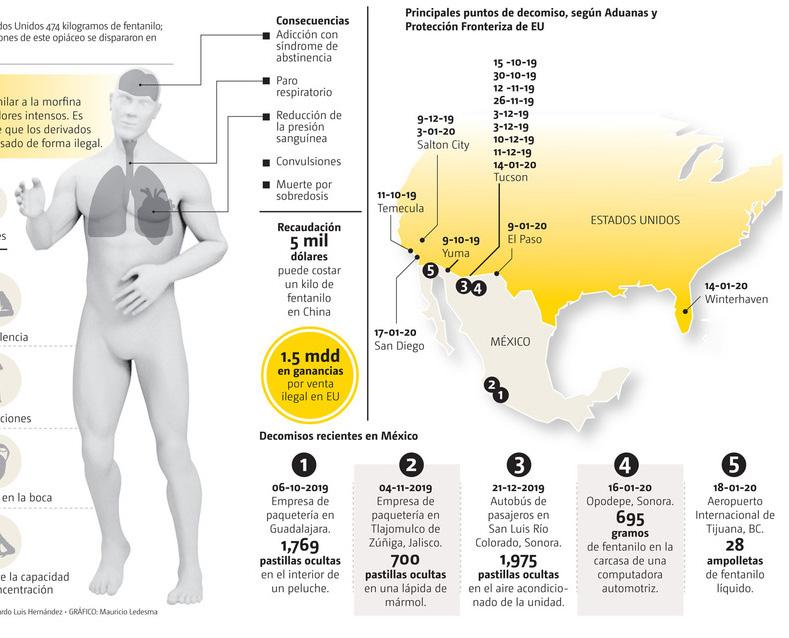 Aunque las cantidades de la droga decomisada no son tan espectaculares como las de otras —por ejemplo la cocaína, que se duplicó de 2018 a 2019, al pasar de 23.2 a 40.1 toneladas interceptadas—, este opioide de origen sintético se ha establecido como la principal preocupación del gobierno de Donald Trump en materia de combate a las drogas, debido a su peligrosidad y la facilidad con la que sus usuarios pueden caer en una sobredosis, se