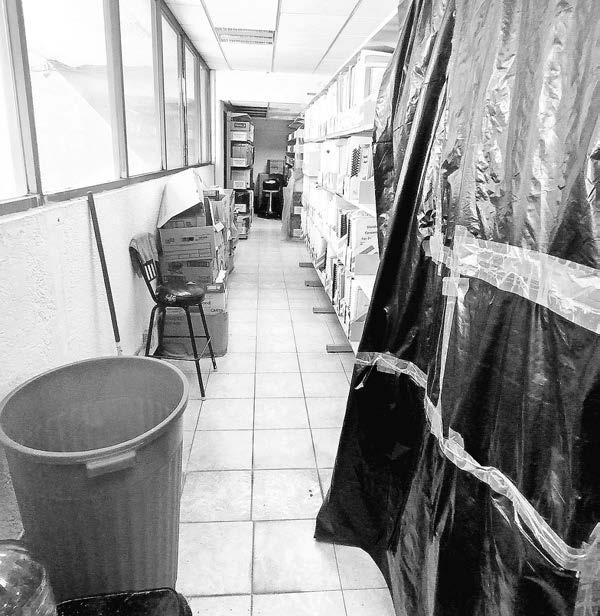 En la época de lluvias, los pasillos se inundaron y trazaron un camino de cubetas del que aún hay huellas y un rastro de plafones, por todas partes, que hoy son huecos que dejan al descubierto las tuberías y las estructuras internas del inmueble.
