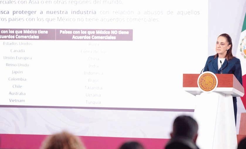 El Gobierno de México, a través de la Secretaría de Economía, informó que el objetivo del Paquete Arancelario, que entrará en vigor a partir del 1 de enero de 2026, tiene como objetivo cuidar 350 mil empleos de las industrias automotriz, siderúrgica, calzado, textil y vestido en los estados de Aguascalientes, Baja California, Chihuahua, Coahuila, Estado de México, Guanajuato, Jalisco, Nue-vo León, Puebla y Querétaro, esto sin dañar a ningún país en específico ni afectar las relaciones comerciales con Asia o con otras regiones del mundo con los cuales no se tiene tratado comercial.