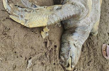 Aunque no se ha confirmado las casus de la muerte, el caparazón de la tortuga presenta una abertura que prácticamente provocó que expusieron sus órganos.