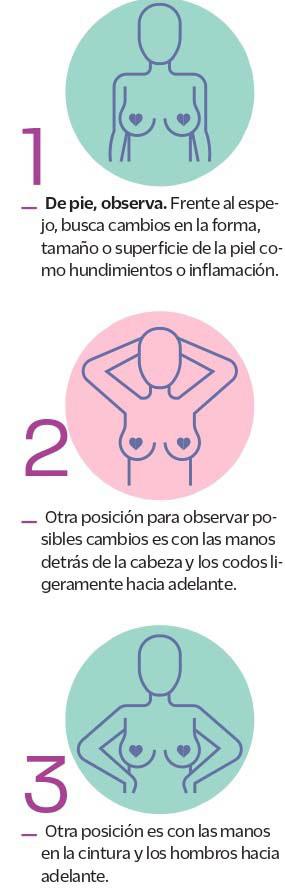 Después de reconocer los senos frente al espejo, el siguiente paso consiste en la palpación. Para ello, deben estar acostadas, poner un brazo detrás de la nuca y comenzar a tocar el seno. Si se empieza con el lado derecho, entonces hay que realizar la exploración con las yemas de los tres dedos medios de la mano izquierda y, posteriormente, cambiar. “Pueden empezar a hacer círculos desde el pezón, como una espiral desde dentro hacia afuera. Deben evaluar cómo se siente la mama y revisar si se percibe algún bulto o dolor anormal. Otra forma es iniciar desde arriba de la mama y con los dedos dirigirse hacia abajo, donde termina ésta. Luego, hay que volver a subir para recorrerla por completo.