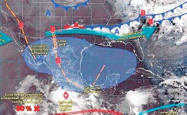 Su circulación y las condiciones de humedad provocan lluvias muy fuertes en Guerrero y Michoacán; así como fuertes en Colima y Jalisco, con oleaje elevado en las costas de estos estados.