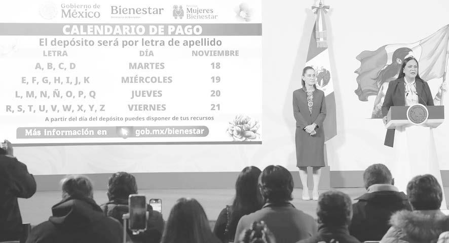 El Gobierno de México, a través de la Secretaría de Bienestar, informó que, del 18 al 21 de noviembre, las mexicanas de entre 60 y 64 años que se registraron en agosto a la Pensión Mujeres Bienestar y recibieron su tarjeta en octubre, se les otorgará su primer pago de este apoyo de 3 mil pesos bimestrales. En la conferencia matutina: “Las mañaneras del pueblo”, que encabeza la Presidenta de México, Claudia Sheinbaum Pardo, la secretaria de Bienestar, Ariadna Montiel Reyes, detalló que el depósito se realizará de acuerdo con la letra del primer apellido bajo el siguiente calendario: