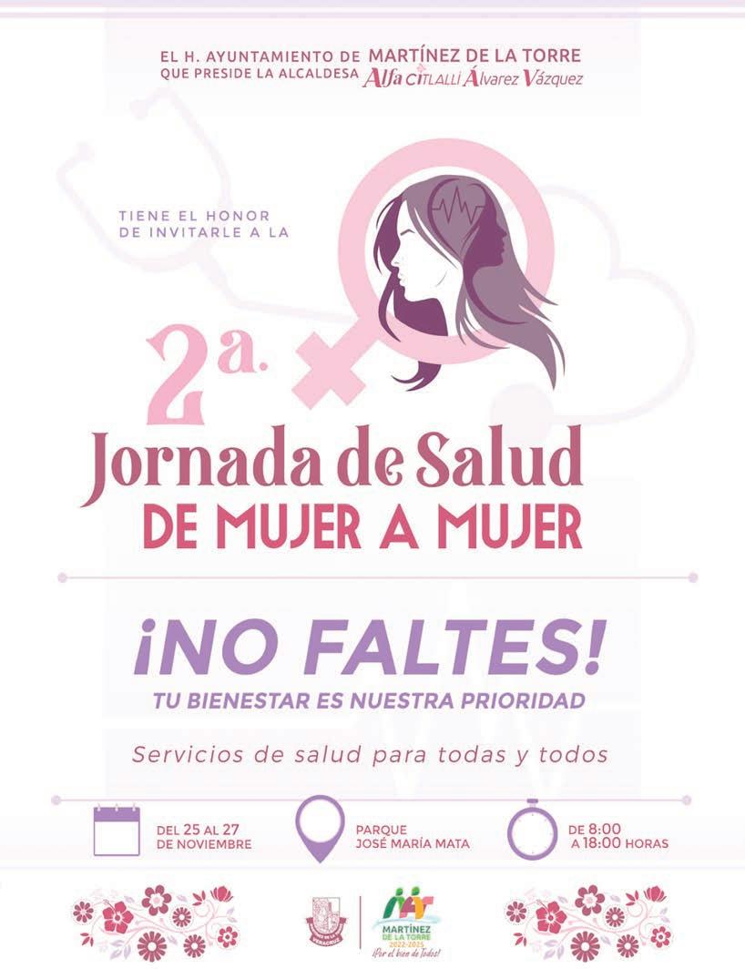 El Ayuntamiento de Martínez de la Torre que preside la Química Alfa Citlalli Álvarez Vázquez anunció la 2ª Jornada de Salud “De Mujer a Mujer”, la cual se llevará a cabo los días 25, 26 y 27 de Noviembre debido a la buena respuesta que se tuvo en la primera Jornada.
