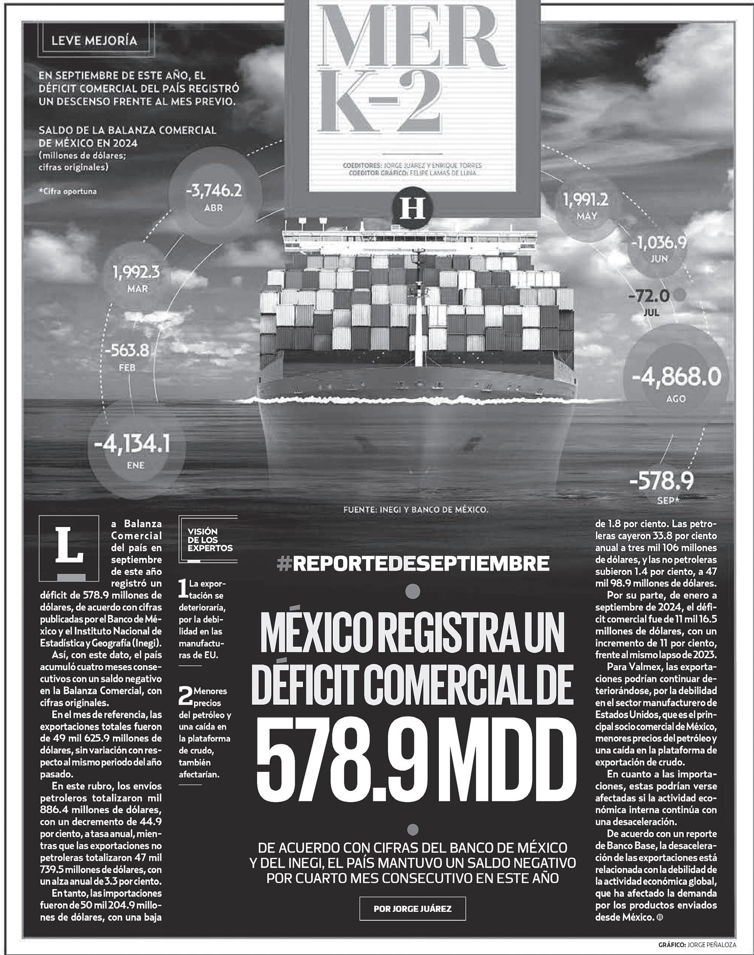 14.2% exportaciones mexicanas en octubre »REDACCIÓN CIUDAD DE MÉXICO- El valor de las exportaciones mexicanas repuntó en octubre, con lo que ligó cinco meses al alza, de acuerdo con los datos oportunos publicados por el Instituto Nacional de Estadística y Geografía (Inegi). Las ventas totales de mercancías al exterior reportaron un aumento anual de 14.2% en el décimo mes del año, luego de un incremento de 13.8% en septiembre. El valor de las ventas al exterior de mercancías alcanzó 66.1 mil millones de dólares en octubre, cifra integrada por 64 mil 312 millones de dólares de ventas no petroleras y por 1 mil 820 millones de dólares de las petroleras. Lo anterior significó una contracción anual de 29.8% en las exportaciones petroleras y un incremento de 16.3% en las no petroleras. Al interior de las exportaciones no petroleras, las dirigidas a Estados Unidos avanzaron 17.1%, donde las automotrices retrocedieron 14.0%, pero el resto logró crecer 33.1%. El valor de las importaciones de mercancías, en octubre de 2025, fue de 65 mil 526 millones de dólares, lo que representó un incremento anual de 12.8%. Dicha cifra fue resultado neto de una baja de 2.6% en las compras petroleras y de un aumento de 16.3% en las no petroleras.