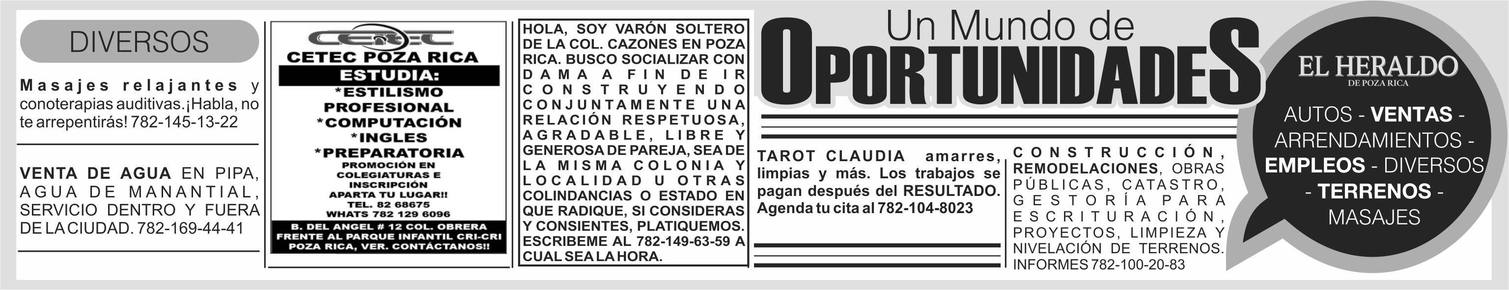 Lunes 27 de Febrero de 2023 02. POZA RICA Director General Lic. Francisco Sánchez Macías Gerente Administrativo Lic. Juan Manuel Huerta Hurtado Jefe de Diseño Editorial Luis Jair Noguera Priego Director Editorial Luis Óscar Rodríguez Jefe de Talleres Javier Hernández Cruz dpozarica2007@gmail.com publicidadhpr@gmail.com CONTACTO REDACCIÓN CONTACTO PUBLICIDAD | elheraldodepozarica.com.mx | JESÚS RODRÍGUEZ POZA RICA JESÚS RODRÍGUEZ POZA RICA El Heraldo de Poza Rica es una publicación de lunes a sábado. Lunes 27 de Febrero de 2023, Año XVI Núm. 4970 Editor responsable Ing. Eduardo Sánchez Macías. Número de Certificado de Reserva de Derecho al Uso Exclusivo del título 04 - 2017 - 070312043500 - 101. Certificado de Licitud de Título: 16965. Certificado de licitud de contenido 16965. Domicilio de la publicación, impreso y distribuido por Grupo Editorial Heraldo de Veracruz, con domicilio en Privada 16 Norte No. 130 Col. Obrera, Poza Rica de Hidalgo, Ver. C.P. 93260 Tel. (782) 826 86 36 y (782) 824 6193 PRIMERA SECCIÓN