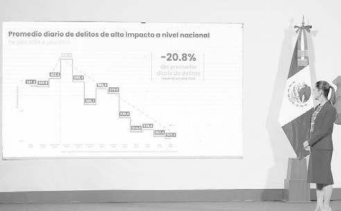 CIUDAD DE MÉXICO.- El Gobierno de México, a través del Gabinete de Seguridad, informó que la implementación de la Estrategia Nacional de Seguridad, durante los 10 primeros meses de la administración de la Presidenta Claudia Sheinbaum Pardo, ha disminuido 25.3 por ciento el promedio diario de víctimas de homicidio doloso, de septiembre de 2024 a julio de 2025; lo que representa 22 homicidios diarios menos.