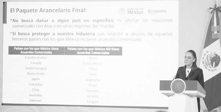 Señaló que con el paquete arancelario se estima una recaudación de alrededor de 30 mil millones de pesos (mdp) anuales. Además, destacó que se está en pláticas con todos los países con los cuales no se tiene acuerdo comercial, a través de la Secretaría de Economía, los embajadores y la Secretaría de Relaciones Exteriores (SRE).