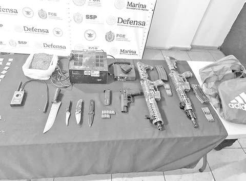 A los detenidos se les aseguraron diversas cantidades de droga, dos armas largas, un arma corta, casquillos diversos, armas blancas, esposas metálicas, así como 2 vehículos, una camioneta Tiguan y un auto Nissan ambos con reporte de robo.