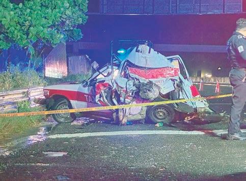 La unidad Nissan Tsuru color oficial, quedó destrozado, y una mujer —pasajera del taxi— perdió la vida al quedar prensada en el asiento trasero.