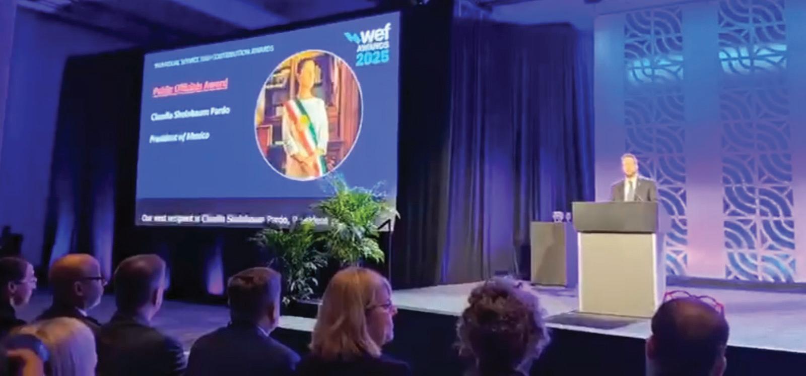 La Water Environment Federation (WEF) galardona a la Presidenta Claudia Sheinbaum con el Premio Public Officials Award, siendo la primera Jefa de Estado en recibir un reconocimiento de este tipo, por su liderazgo e impulso en pro -