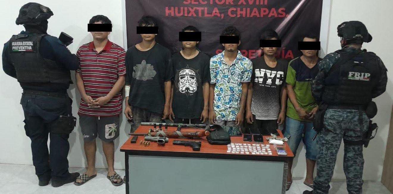 Derivado de los trabajos de inteligencia policial desplegados en la zona del municipio de Huixtla, elementos de la fuerza de seguridad detuvieron a siete presuntos integrantes de banda denominada “Los Chiquis”, en las colonias Bella Vista y El Relicario.