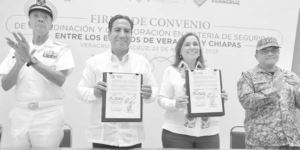 la ruta Coatzacoalcos–Las Choapas–Chiapas, vital para comercio y tránsito. Este acuerdo, el tercero que firma la Mandataria –tras suscribirlo en marzo con Oaxaca y Puebla–, representa un paso más en la consolidación de un frente regional para la construcción de la paz en el sur-sureste del país. En la ceremonia participaron tam-