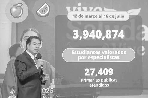 ras del pueblo. El secretario de Educación Pública, Mario Delgado Carrillo, informó que durante las Jornadas de Salud se desplegaron 738 brigadas con 7 mil 744 brigadistas, entre enfermeras, enfermeros, promotores de la salud de la Secretaría de la Salud, personal del DIF y de la SEP, quienes realizaron durante sus visitas medición de peso y talla, revisión de salud y bucal, además de que brindan pláticas sobre estilos de vida saludables. Detalló que los resultados de las valoraciones conforman el expediente de salud escolar y serán enviados por correo electrónico o por mensaje a padres o madres de familia, podrán ser