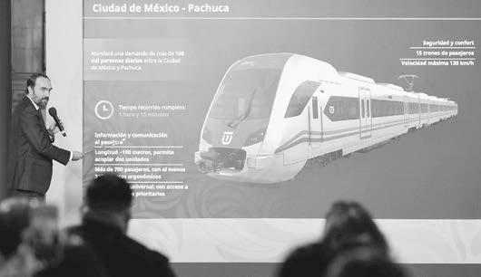 Destacó que, además, el 3 de diciembre se realizó el fallo en la licitación de 47 trenes de pasajeros, que tendrán 65 por ciento de contenido nacional, y que darán servicio a la ruta Ciudad de México-QuerétaroIrapuato. Detalló que los trenes atenderán una demanda de más de 100 mil personas diarias, tendrán una longitud de 100 metros, permite acoplar dos unidades, tienen una capacidad de 700 pasajeros con al menos 315 asientos ergonómicos, además de que contarán con accesibilidad universal.