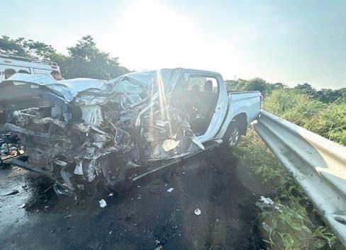La camioneta quedó destrozada de la parte frontal, mientras que el tráiler presentó daños considerables en el costado izquierdo.