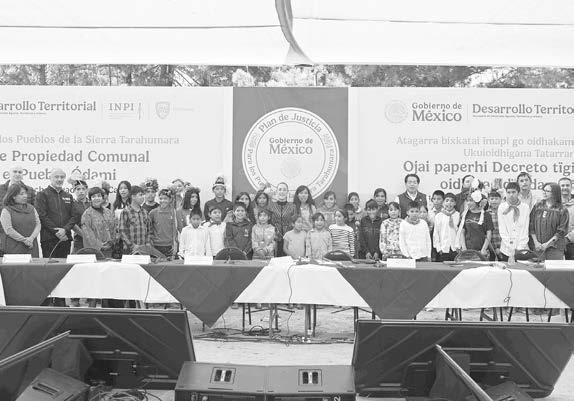 justicia territorial con la titulación de más de 2 mil 178 hectáreas a las comunidades rarámuris de la Sierra Tarahumara, más de 5 mil 956 hectáreas a la comunidad wixárika de San Sebastián Teponahuaxtlán y su anexo Tuxpan; 317 hectáreas a la comunidad rarámuri Mogótavo y 502 hectáreas a la comunidad Ódami Mesa Colorada. El director general del Instituto Nacional de los Pueblos Indígenas (INPI), Adelfo Regino Montes, detalló que con estas 3 mil 27 hectáreas que se restituyen, suman 6 mil 26 hectáreas de la Sierra Tarahumara devueltas a sus pueblos originarios; adicional al apoyo del Programa