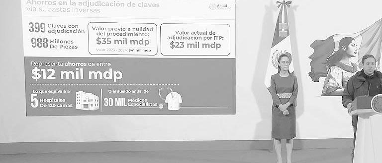 La Presidenta de México, Claudia Sheinbaum Pardo, informó que, gracias al mecanismo de subasta inversa, se logró un ahorro de 12 mil millones de pesos (mdp) en la adquisición de 399 claves, equivalentes a 988 millones de piezas como parte de la Compra Consolidada de Medicamentos e Insumos Médicos 2025-2026.