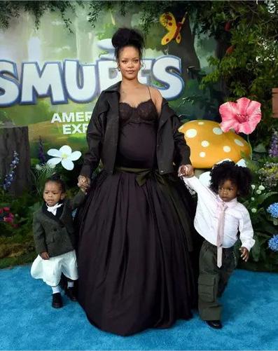 Rihanna posa con sus dos hijos en la alfombra roja de Los Pitufos