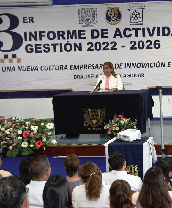 La directora de la Facultad de Ciencias de la Administración Campus IV Tapachula, Isela Ramírez Aguilar, presentó su 3er. Informe de Actividades correspondiente a la gestión 2022 – 2026, “Por una nueva cultura empresarial de innovación e inclusión social”. En su mensaje, Ramírez Aguilar dijo que en las 4 licenciaturas a cargo de esta unidad académica se atienden mil 633 estudiantes y anunció la apertura de la sede de la Facultad en Cacahoatán para el ciclo agosto-diciembre 2025, en donde se impartirán las licenciaturas en Administración y Gestión Turística.