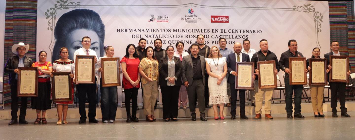 En un acto simbólico y significativo, los ayuntamientos de Comitán de Domínguez y San Cristóbal de Las Casas formalizaron un hermanamiento, junto con otros municipios chiapanecos, como parte de las festividades conmemorativas por el centenario del nacimiento de Rosario Castellanos Figueroa, figura emblemática de la literatura mexicana. La ceremonia se llevó a cabo en el teatro Junchavín de Comitán, ciudad natal de la escritora. El acuerdo fue firmado por el presidente municipal de Comitán, Mario Antonio Guillén Domínguez, y el síndico del ayuntamiento de San Cristóbal, Jorge Alejandro Ruiz Hernández, en representación de la presidenta municipal, Mtra. Fabiola Ricci Diestel. El hermanamiento fue presentado como un acto de reconocimiento mutuo, respeto a las raíces comunes y voluntad compartida de construir un futuro más justo, incluyente y cultu-