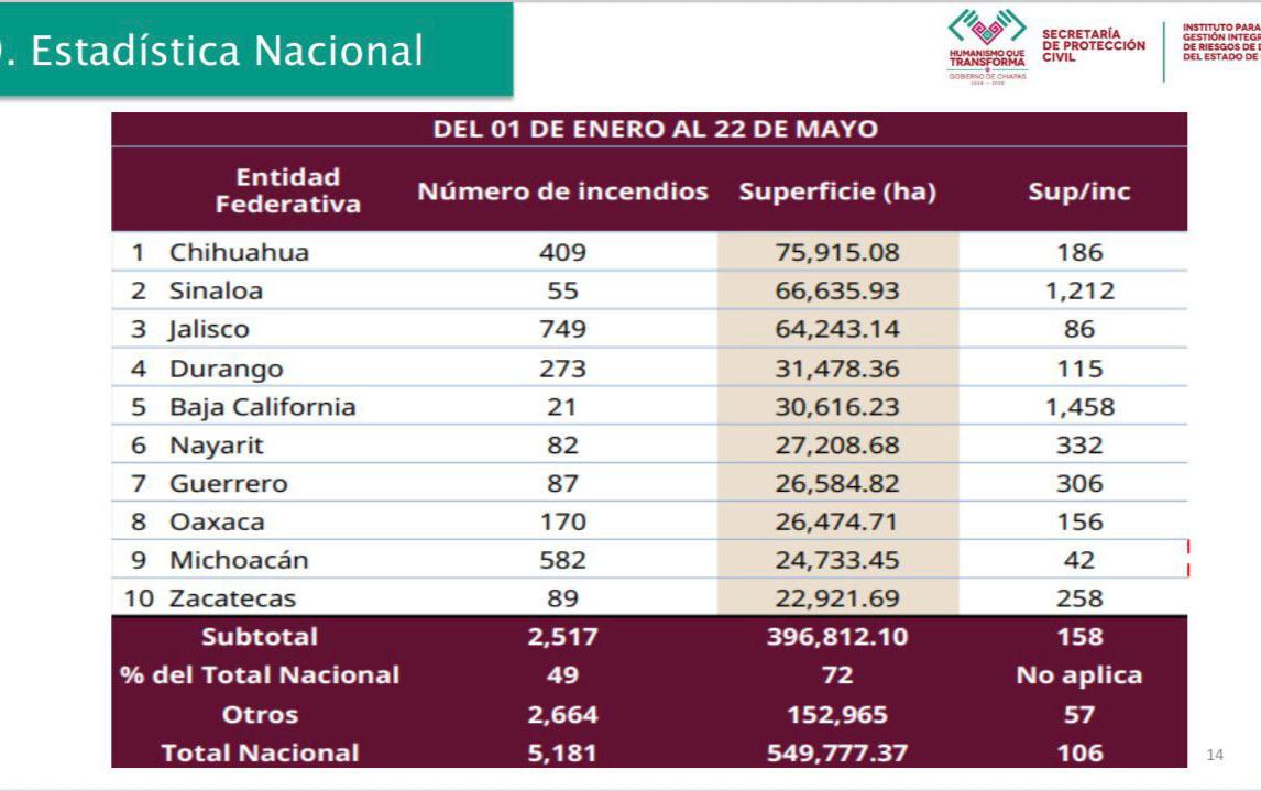 Datos de la estadística nacional ubican a Chihuahua, Sinaloa, Jalisco, Durango y Baja California como los primeros lugares con superficie afectada por incendios forestales. Destaca la participación de 10 mil 922 días/hombre de diversas dependencias como la Secretaría de Protección Civil Estatal, Conafor, Conanp, Semahn, Defensa, Gobierno Municipal, Guardia Nacional, Protección Civil Municipal y propietarios.