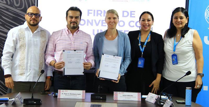 La Secretaría de Educación y el Fondo de las Naciones Unidas para la Infancia (Unicef), a través de su titular, Roger Mandujano Ayala y su jefa de Educación en México, Astrid Hollander, respectivamente, firmaron este miércoles un convenio de colaboración que tuvo efecto en las instalaciones de la dependencia estatal.