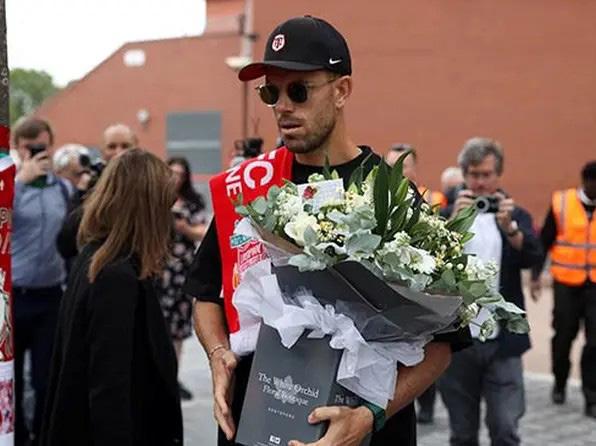 Jordan Henderson vistió de negro, llevó un arreglo floral y una bufanda del Liverpool. El seleccionado inglés se puso de cuclillas, quedó en silencio y lloró ante las imágenes de su amigo y compañero.