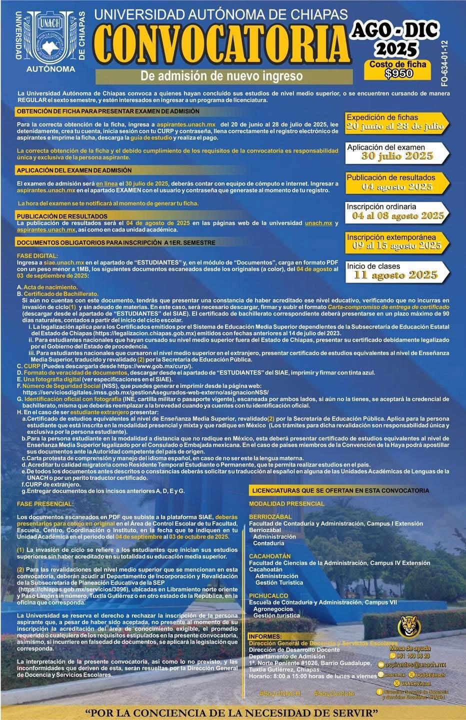 El examen de admisión se llevará a cabo en línea el 30 de julio, y los resultados se publicarán el 4 de agosto en cada unidad académica, así como en las páginas web www. unach.mx y www.aspirantes.unach.mx, mientras que el inicio de clases está presupuestado para el 11 de agosto del 2025.