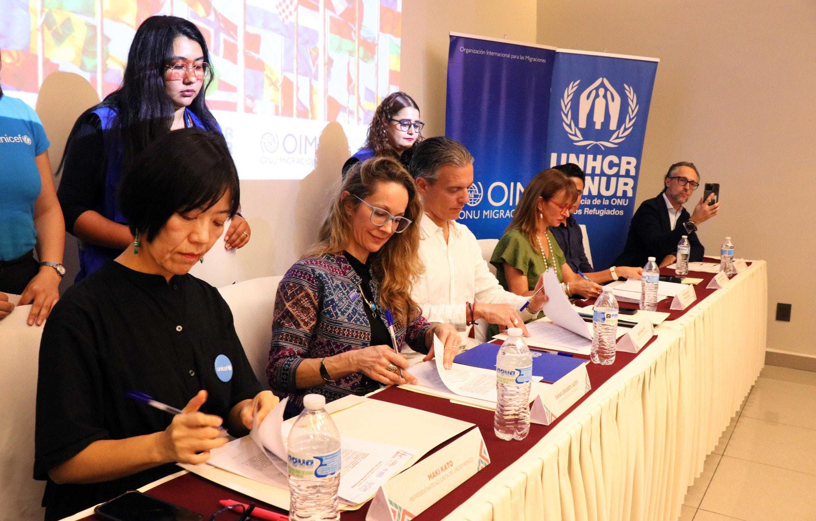 te adjunta de Unicef en México, Maki Kato, quienes signaron este compromiso para fortalecer la atención humanitaria y la protección de las personas en contexto de movilidad.