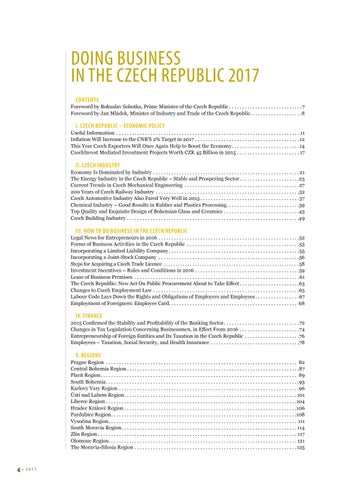 DOING BUSINESS IN THE CZECH REPUBLIC 2017 CONTENTS Foreword by Bohuslav Sobotka, Prime Minister of the Czech Republic . . . . . . . . . . . . . . . . . . . . . . . . . . . . 7 Foreword by Jan Mládek, Minister of Industry and Trade of the Czech Republic. . . . . . . . . . . . . . . . . . . .8