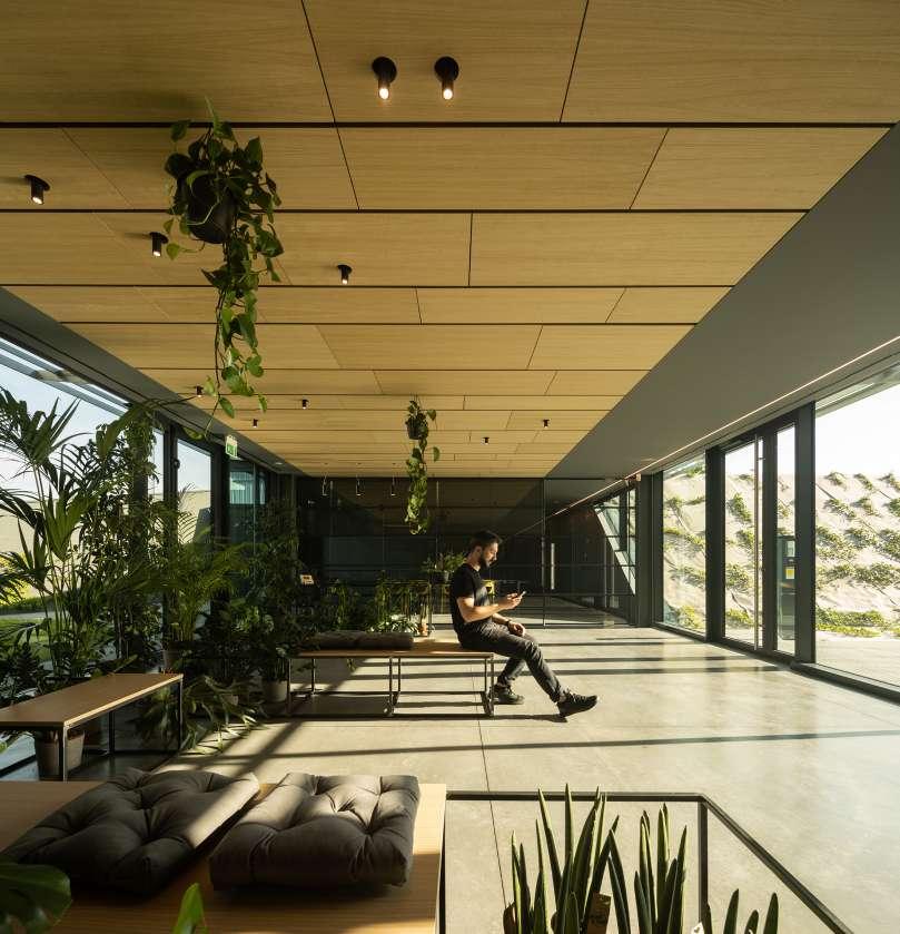 SOSTENIBILITÀ. Le scelte progettuali sono tutte orientate al rispetto dei più stringenti requisiti in termini di sostenibilità ambientale. Tutti gli ambienti di lavoro si relazionano peraltro con la presenza di una vegetazione multiforme, sia interna che esterna. Una sorta di elemento che ossigena anche visivamente gli spazi. L’edificio è dotato di un involucro performante, una copertura riflettente, un impianto fotovoltaico integrato e tecnologie impiantistiche per la produzione di fluidi caldi e freddi grazie all’utilizzo di pompe di calore ad alta efficienza.