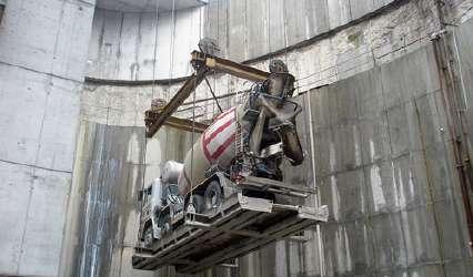 Two robotic booms welding a steel cage