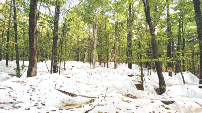 Heureusement, la professeure Audrey Maheu et son équipe entretiennent un tel dispositif depuis 2021 dans des érablières naturelles de Montebello à Kenauk Nature, en Outaouais. Ce dispositif offre l’occasion d’étudier les effets de la sécheresse sur la coulée. Pendant 3 ans, l’équipe d’Audrey Maheu a installé des bâches dans 6 parcelles de 20 m par 20 m sous la canopée (Figure 1) en mai, pour les retirer en septembre. Les précipitations qui y tombent sont évacuées hors des parcelles. Bien qu’il y ait des interstices entre les bâches, que l’eau puisse s’écouler sur les troncs ainsi que s’infiltrer sur les marges des parcelles, ce type de dispositif permet de réduire les précipitations atteignant le sol d’environ 75 %. Pour chaque parcelle d’exclusion, il y avait également une parcelle témoin composée d’un groupe d’arbres similaires situé à 100 mètres ou moins. Sur cette parcelle, aucune bâche n’était installée et les mêmes mesures y étaient effectuées.