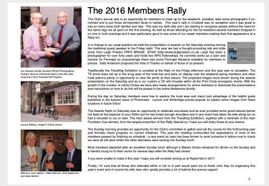 Hopefullyyou’ve enjoyedthisreminder ofthemaintrophy winnersfromthis yearscompetitions. Whilstthemonthly foliosoccupymostof ourattentionoverthe yearthesetwo competitionsserveto takestockandgiveus allanopportunityto enjoytheexcellent workondisplay everymonthacross theCircles. Whilstwemakeas manyoftheseprints availableattheRally asspacepermitsand alsoproduce slideshowswhichare postedtoYouTube nothingbeatsbeing attheRallyinperson. Willweseeyounext year?Willyoube puttingyourself forwardtohelpus continuetheannual traditionthatJohn Kayhasmanagedand deliveredforovera quarterofacentury! Ilookforwardto seeingasmanyof youaspossiblein Snowdonianextyear!