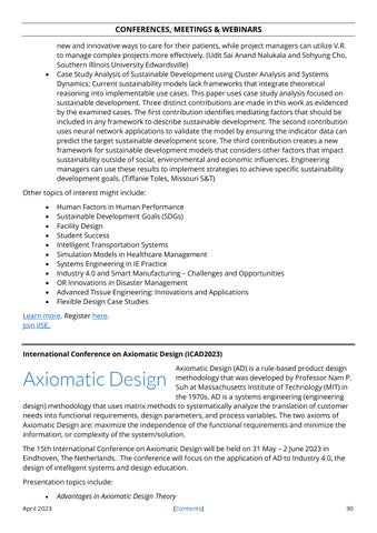 Apart from these exciting articles, we have news and resources pertinent to SE. In addition, we have a mighty set of conferences and events featured in this month’s Newsjournal. From business analysis events, tool vendor conferences, resilience engineering and other domains, there are so many amazing events taking place. We have highlighted thirteen events that I personally would attend if I had the time and capacity to do so. However I am excited to share that I will attend the IISE Annual Conference & Expo in New Orleans in May 2023 alongside this month’s Forum author, Randall Iliff. If you’ll be attending this event, please reach out on LinkedIn or via email. I would love to sit down and have a coffee with you at this event.