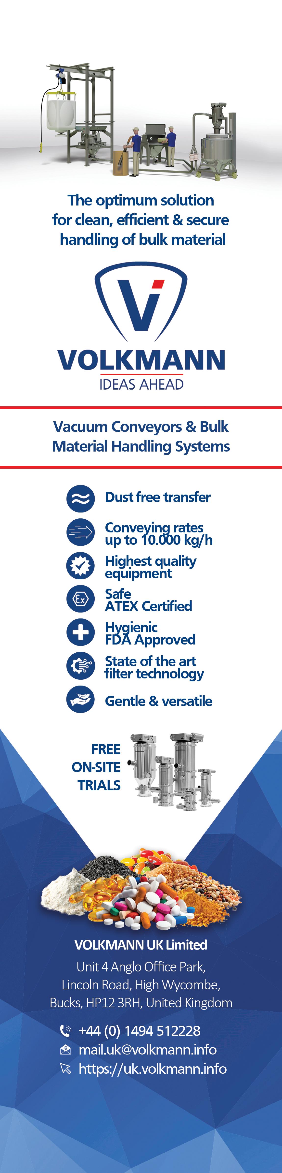 to regulate heat and energy. Volkmann, meanwhile, emphasises its expertise in supplying reliable, hygienic and efficient vacuum-based materials handling for use in different areas of pharma manufacturing. These systems can be used for pharmaceutical powder, granules, finished tablets or other bulk formats throughout the process.