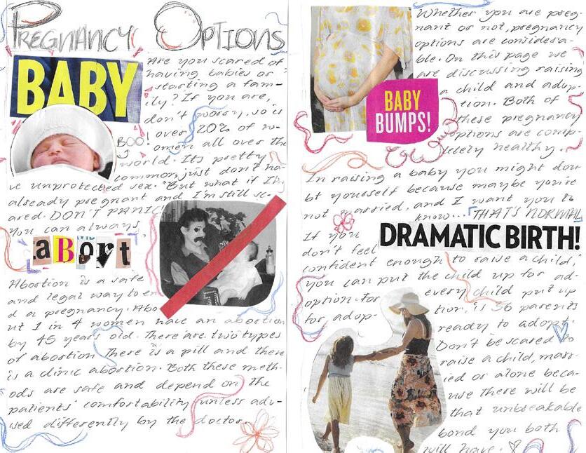 Zines have a rich history of allowing space to express topics that many consider taboo and Jessica and Sophia are embracing this to enhance the sex education they bring to their students. Each semester, students pick a topic and create a two-page spread. With magazines, brochures, and old materials as resources, students delve into topics like healthy relationships, consent, and decisionmaking around sex. Jessica and Sophia emphasize the idea that Zines aren’t about creating perfectly designed pages— Zines are about self expression and fostering powerful conversations around important topics.