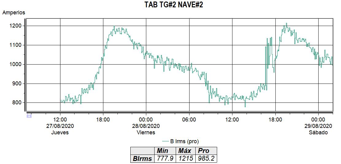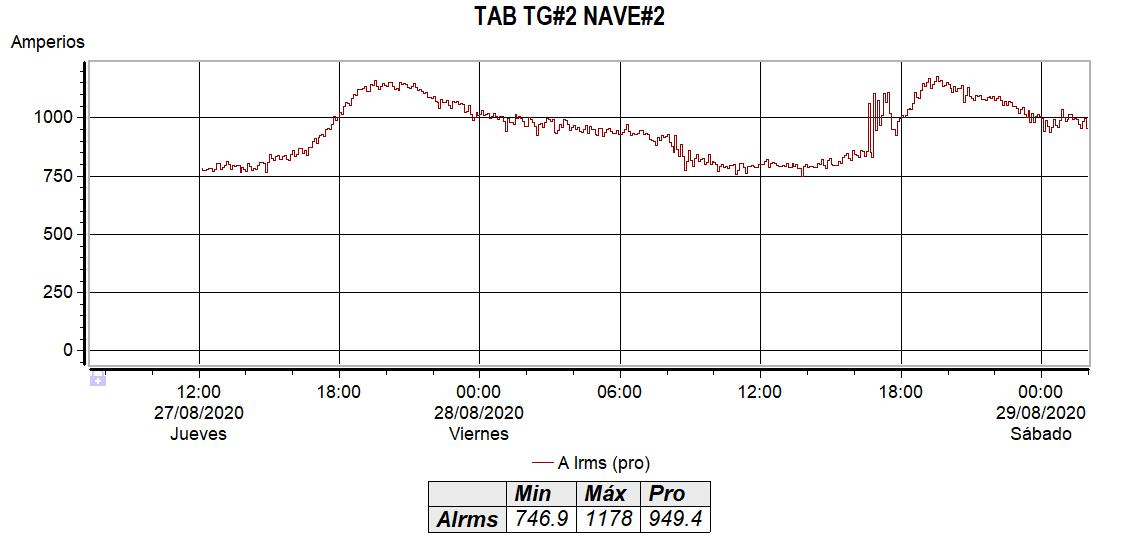 Observación: Se registra una corriente mínima RMS de 2.048 A, máxima RMS de 436.8 A y promedio de 128.0 A.