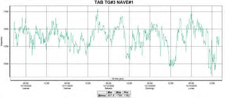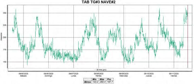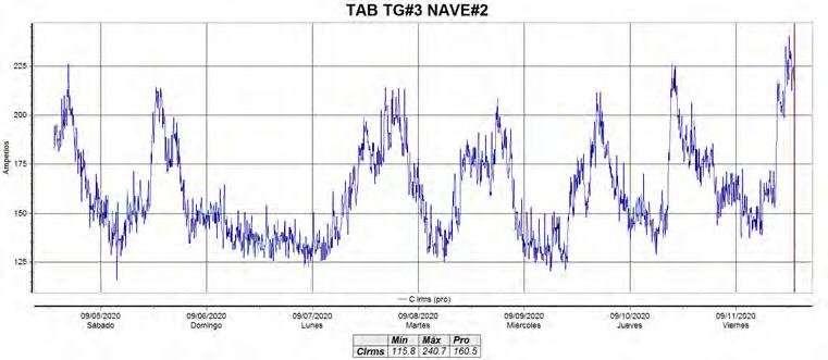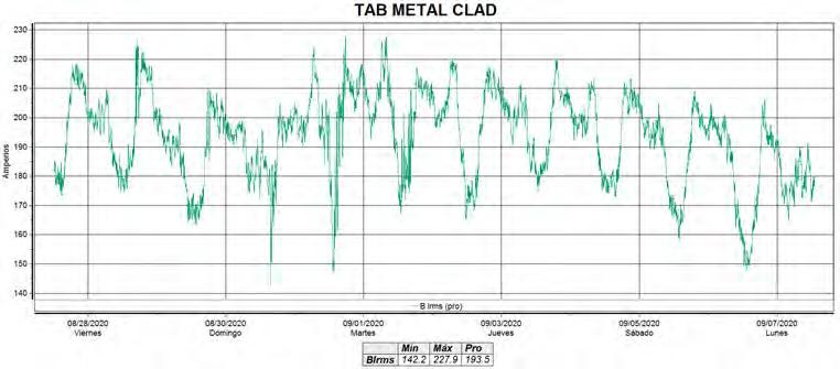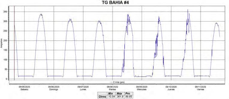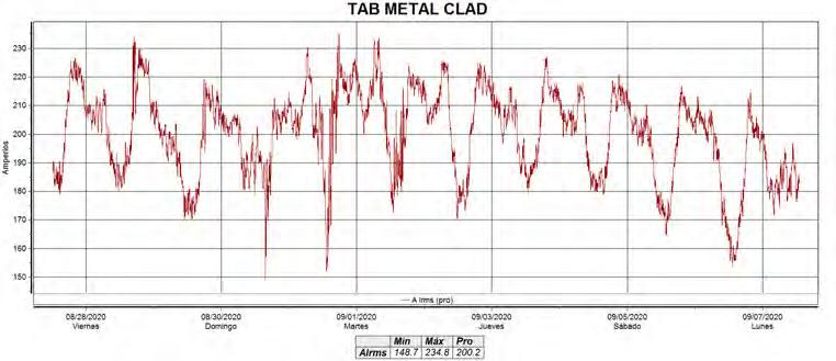 Observación: Se registra una corriente mínima RMS de 10.54 A, máxima RMS de 361.6 A y promedio de 99.85 A.