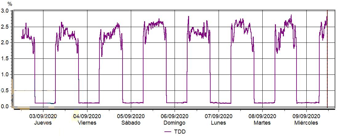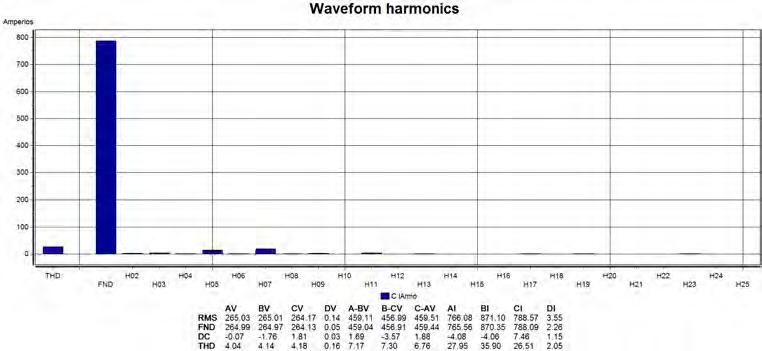 Observación: El valor más alto es el de la 3ª armónica con 5.189% con respecto a la corriente total de la fundamental (285.86 A).