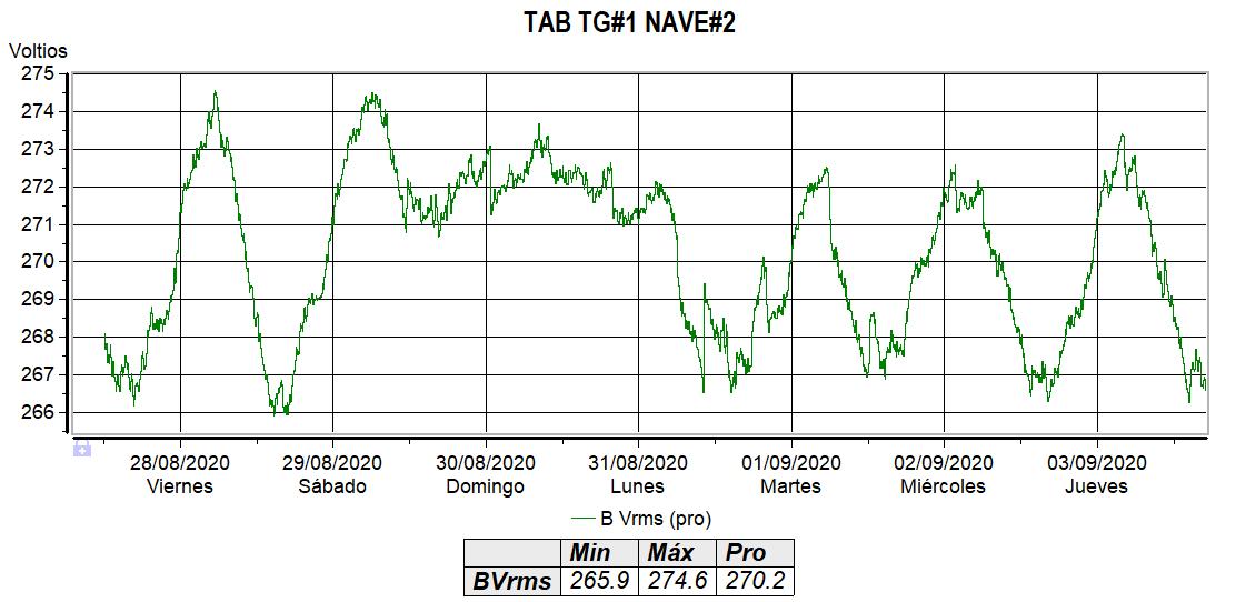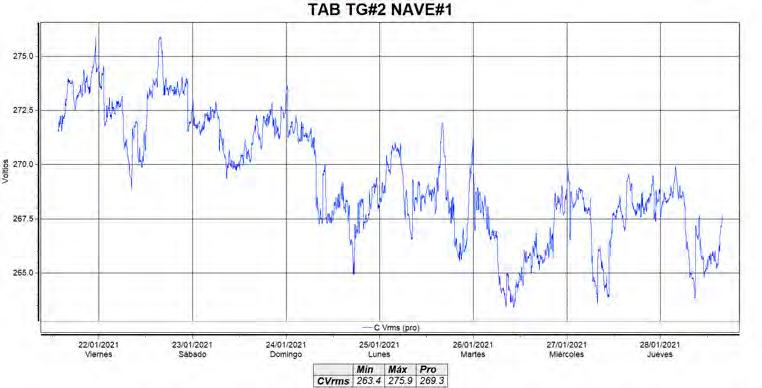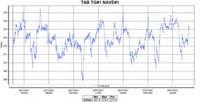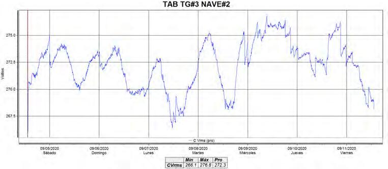 La gráfica anterior muestra los valores RMS de tensión registrados en el lado primario (115 kV) del transformador principal. Se observa que el valor promedio esta alrededor de 113 kV, lo cual es correcto.
