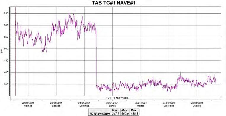 Observación: Se registra una potencia activa total que varía de -363.0 kW a 2.450 kW, con un promedio de -101.6 kW.