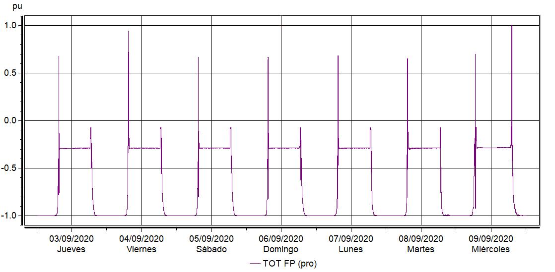 Observación: El factor de potencia oscila entre -0.9991 al 0.9901, siendo la unidad la frontera entre el retraso y el adelanto. En promedio se mantiene en -0.2978.