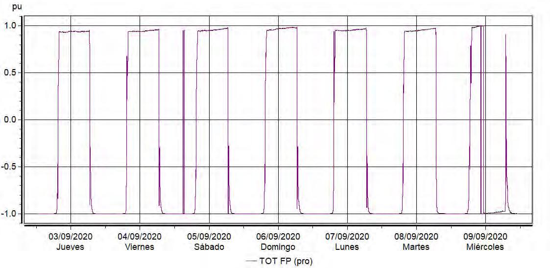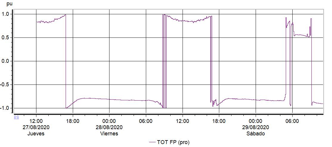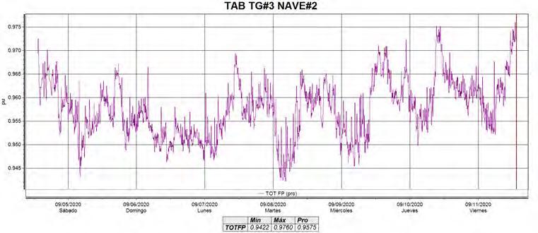Observación: El factor de potencia oscila entre -0.9994 al 0.9995, siendo la unidad la frontera entre el retraso y el adelanto. En promedio se mantiene en -0.6359