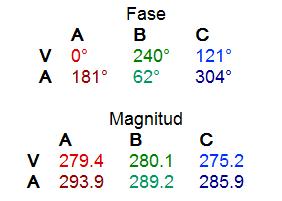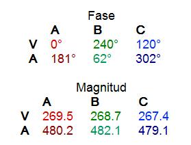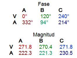 Observación: El valor de la corriente fundamental se registra en 293.87 A., se aprecian algunos componentes armónicos, a continuación, se muestran los valores numéricos.