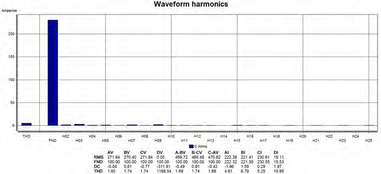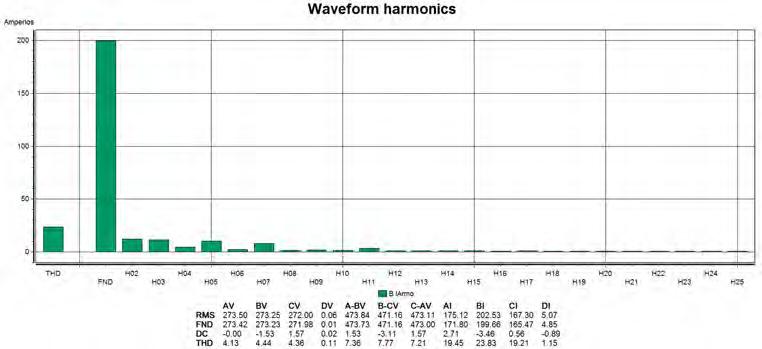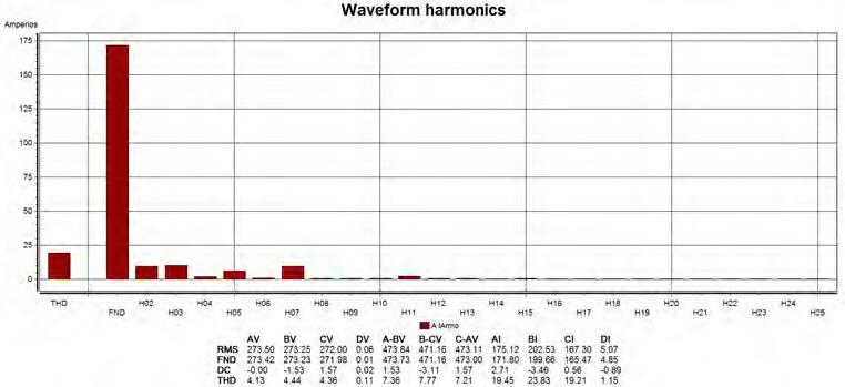 Observación: El valor más alto es el de la 5ª armónica con 17.28% con respecto a la corriente total de la fundamental (228.11 A).