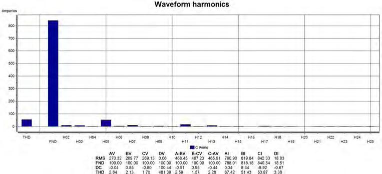 Observación: El valor más alto es el de la 25ª armónica con 34.88% con respecto a la corriente de la fundamental (390.62 A).